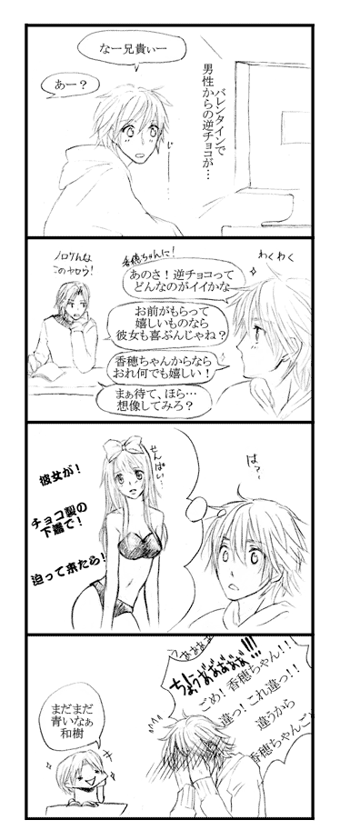 前回、リク絵かバレン/タインかと次の更新悩んでいましたが、もっと広く考えてみればバレンタ/イン当日の更新に間に合うはずもないのに悩むのはおかしいと昨日やっと気づいた朱太ですもうヘタレすぎて目も当てられないね!!